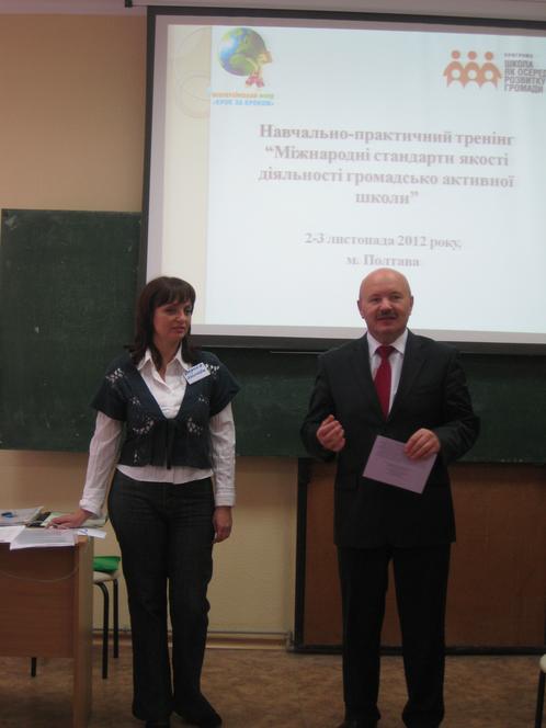 2-3 листопада 2012 року за підтримки Всеукраїнського Фонду «Крок за кроком» та Полтавського обласного інституту післядипломної педагогічної освіти ім.М.В.Остроградського відбувся навчально-практичний тренінг для директорів та координаторів громадсько активних шкіл Полтавської області з проблеми «Міжнародні стандарти якості діяльності громадсько активної школи».