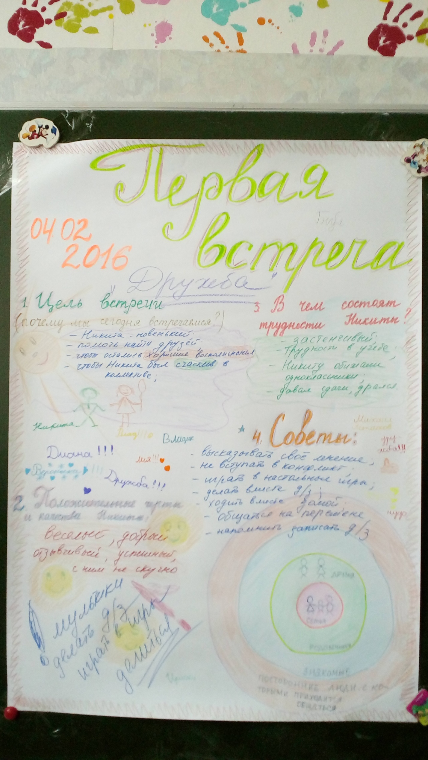 У Мереф'янській загальноосвітній школі І-ІІІ ступенів №6 та Харківській загальноосвітній школі І-ІІІ ступенів №38 проведено педагогічні ради, під час яких педагогічні колективи закладів ознайомлені з метою та завданнями проекту, було визначено напрями реалізації проекту у кожному закладі. Під час загальношкільних та класних батьківських зборів батьки учнів отримали інформацію щодо організації «Кіл друзів».